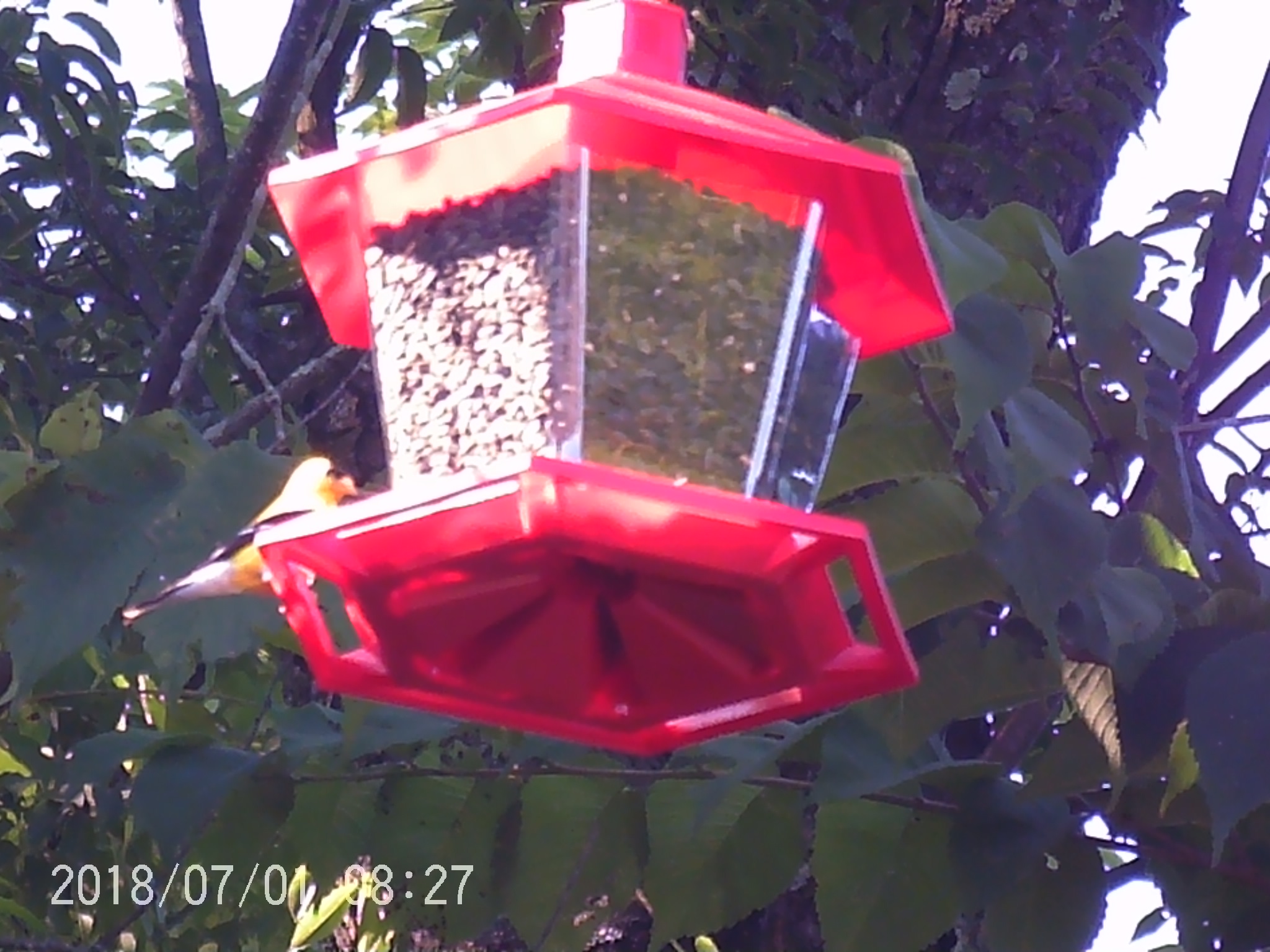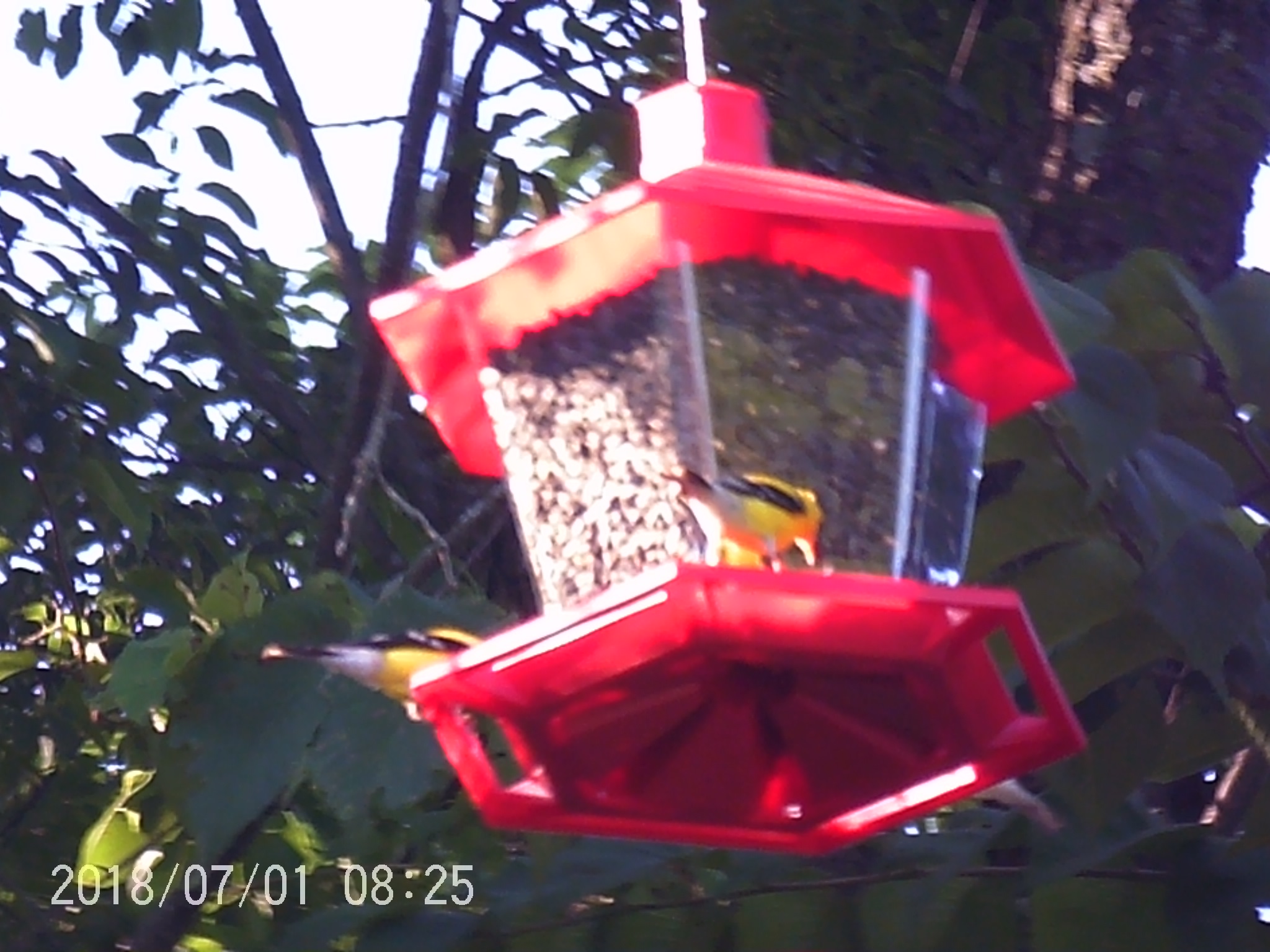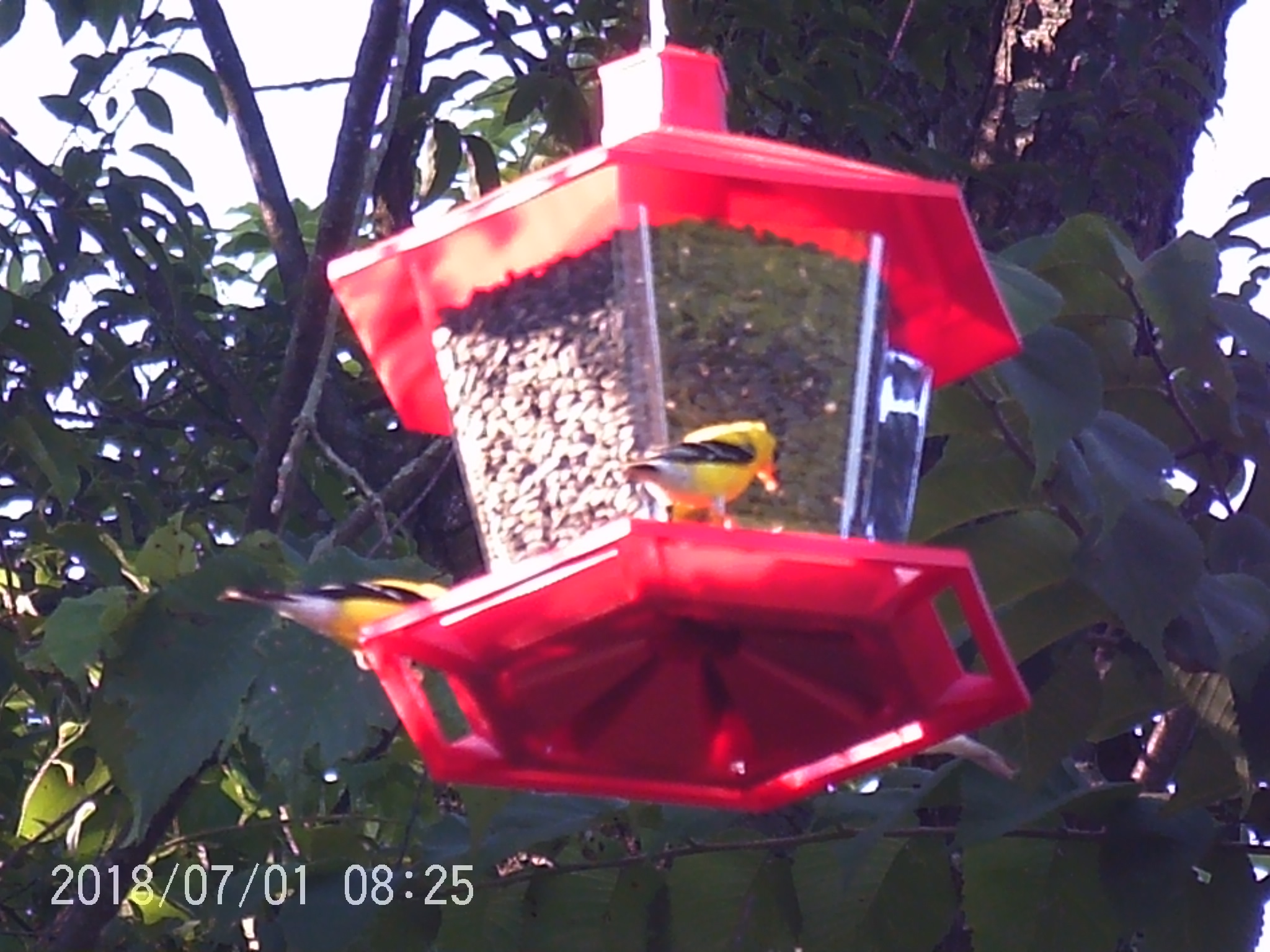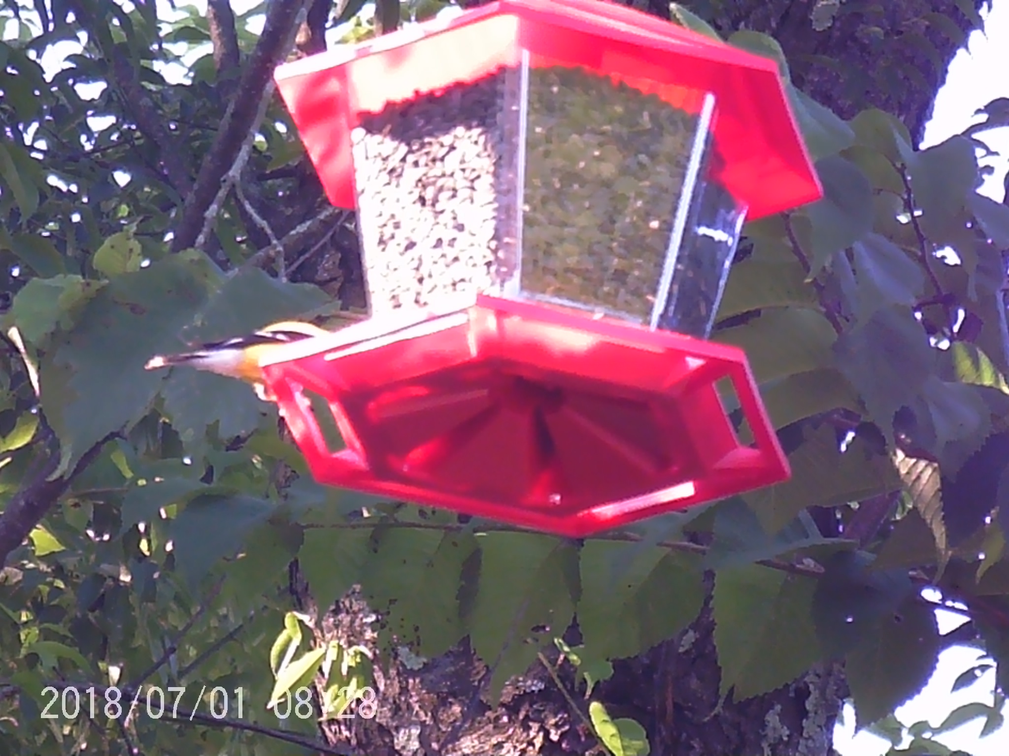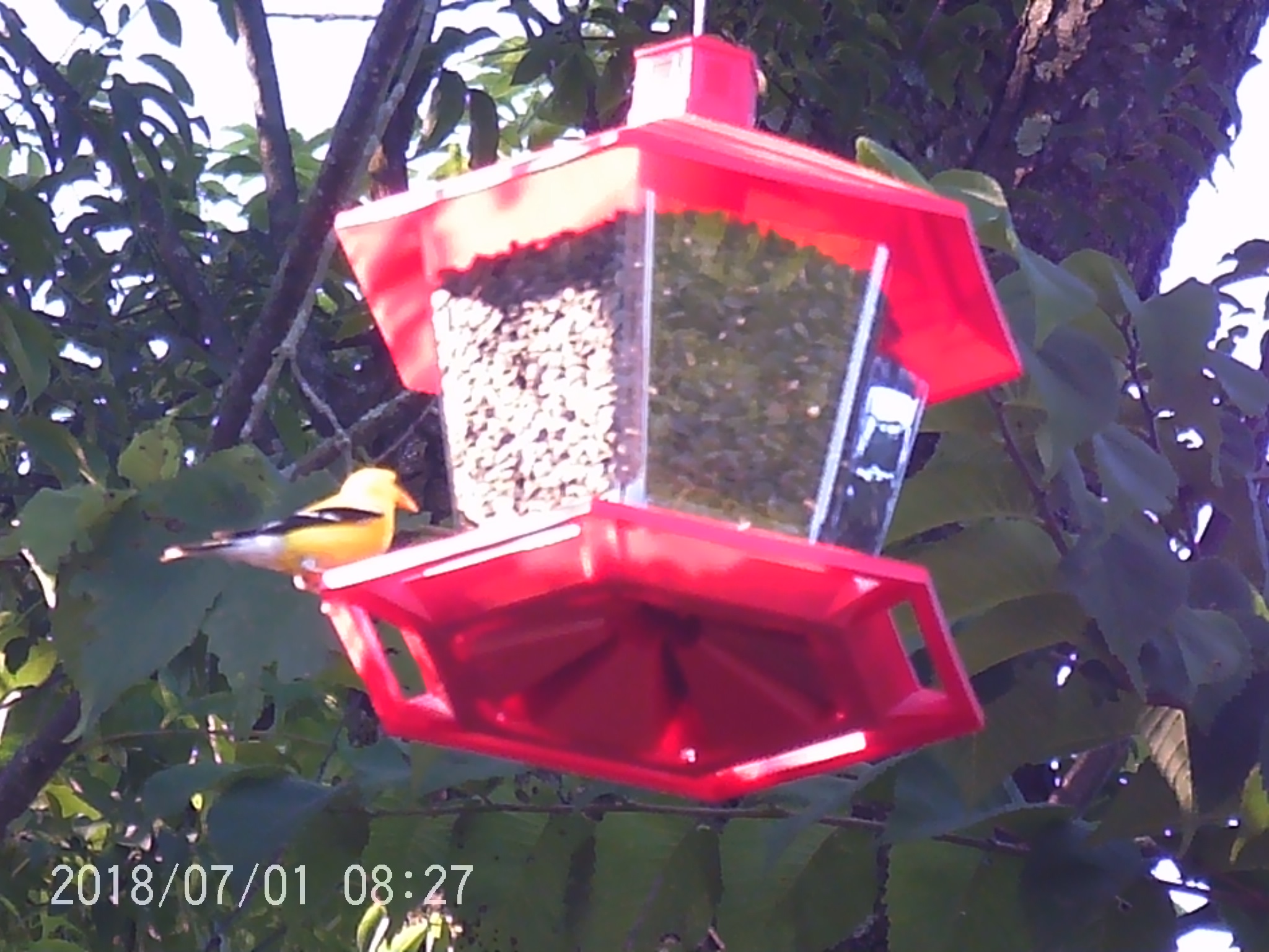 Yesterday afternoon (6/30/18) I purchased and put up his bird feeder. We have bears in the area so I rigged up a branch hanger and a steel cable to raise and lower it so the bears can’t get to it.