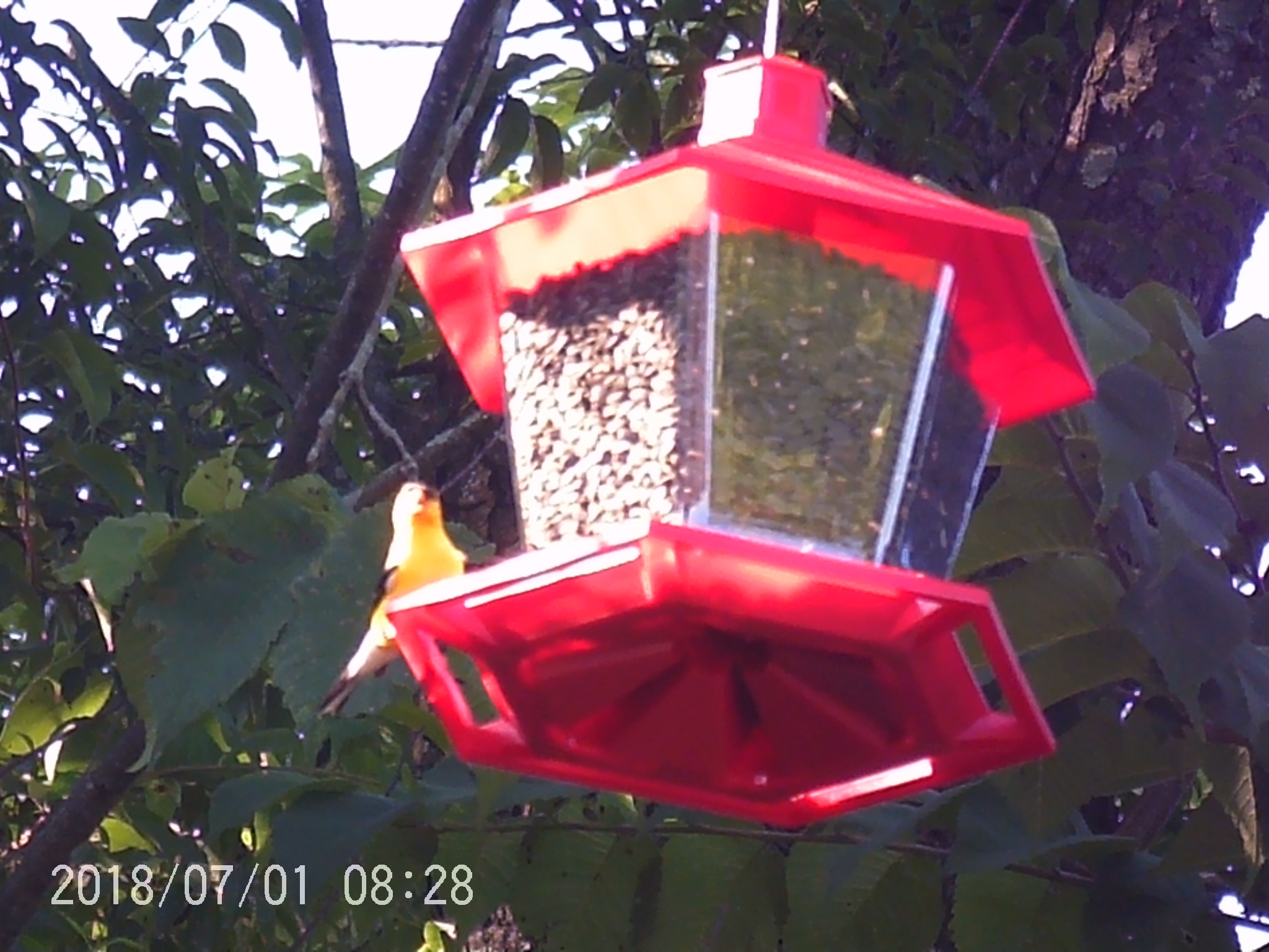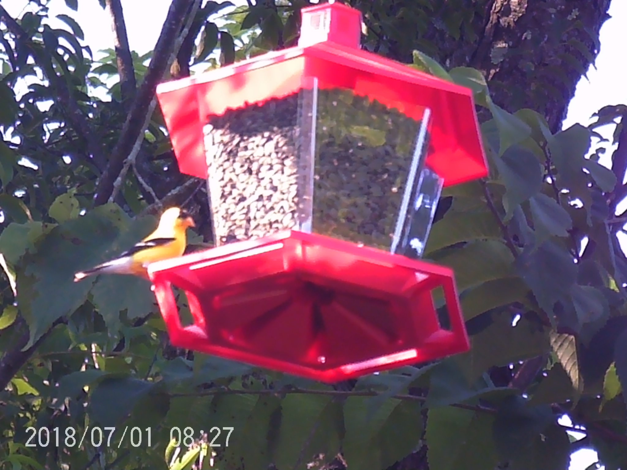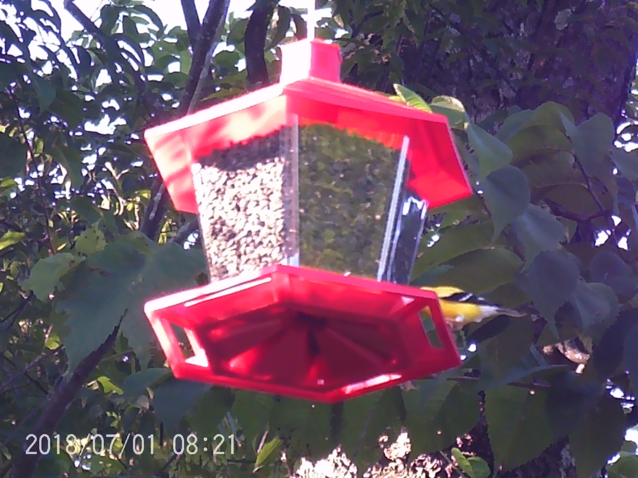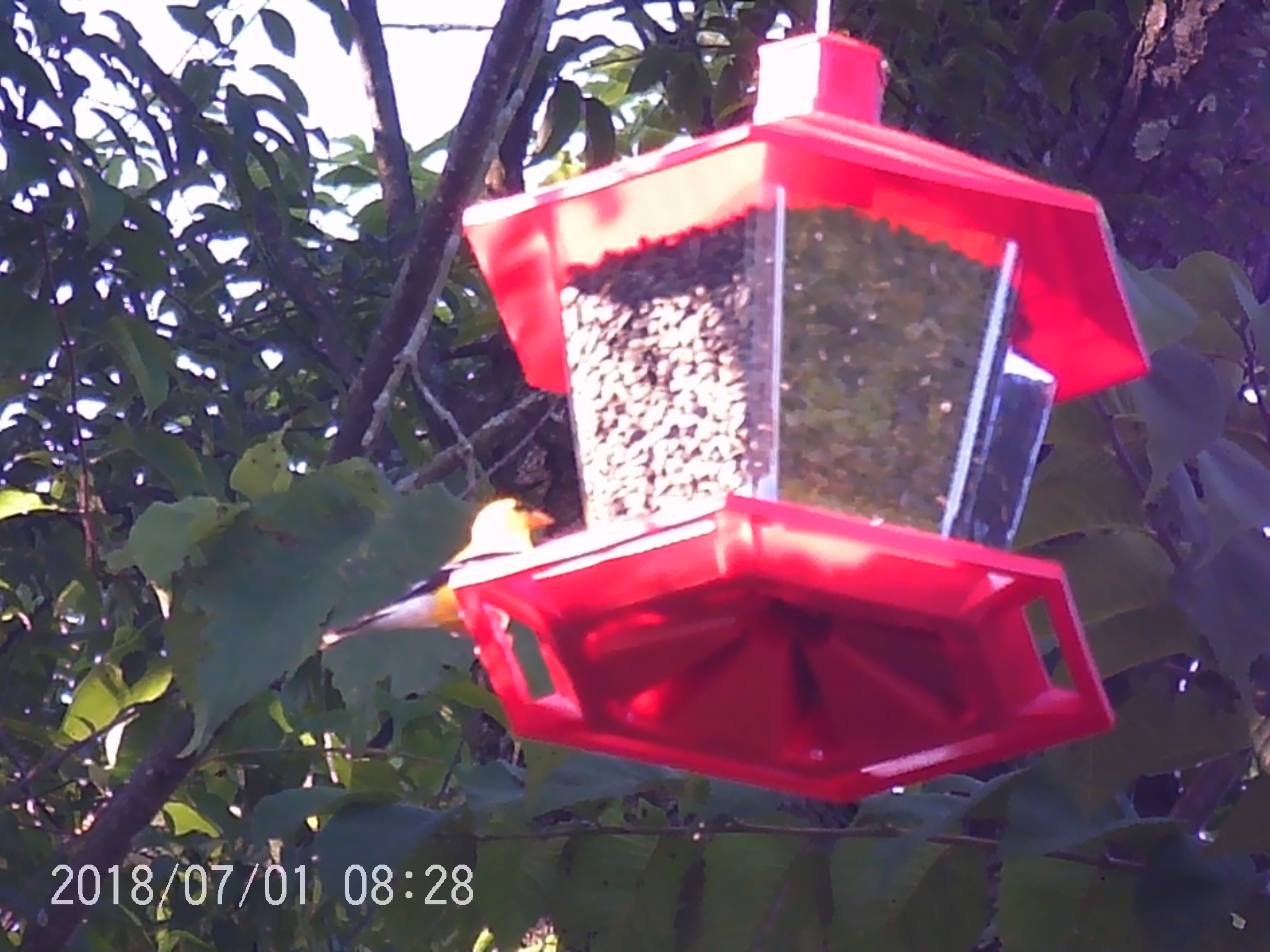 Yesterday afternoon (6/30/18) I purchased and put up his bird feeder. We have bears in the area so I rigged up a branch hanger and a steel cable to raise and lower it so the bears can’t get to it.