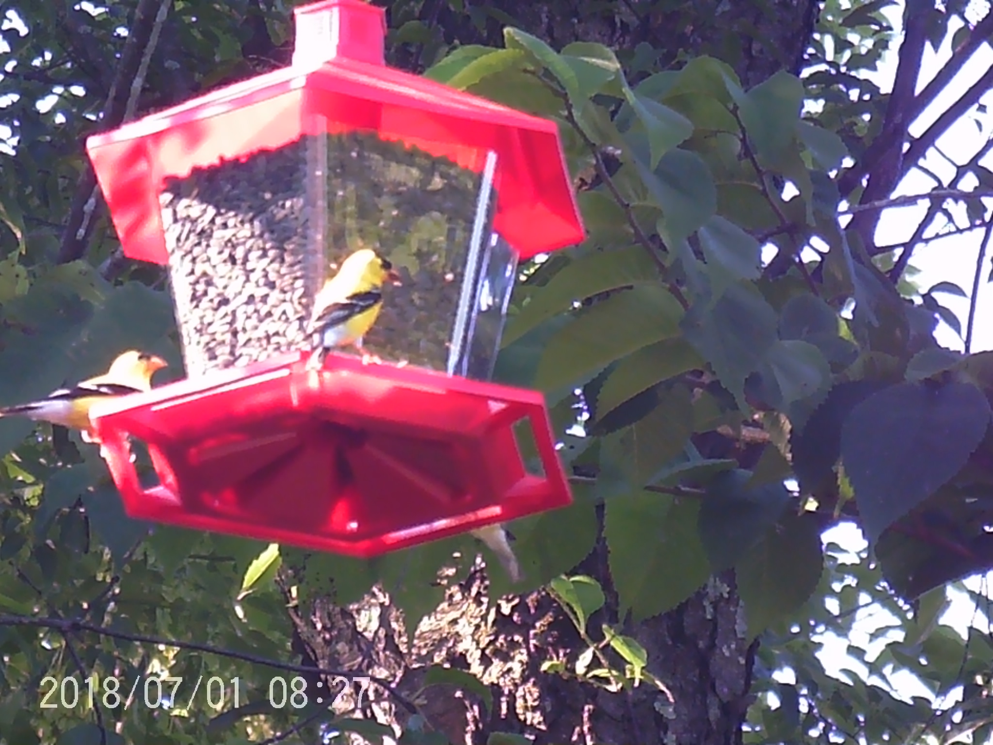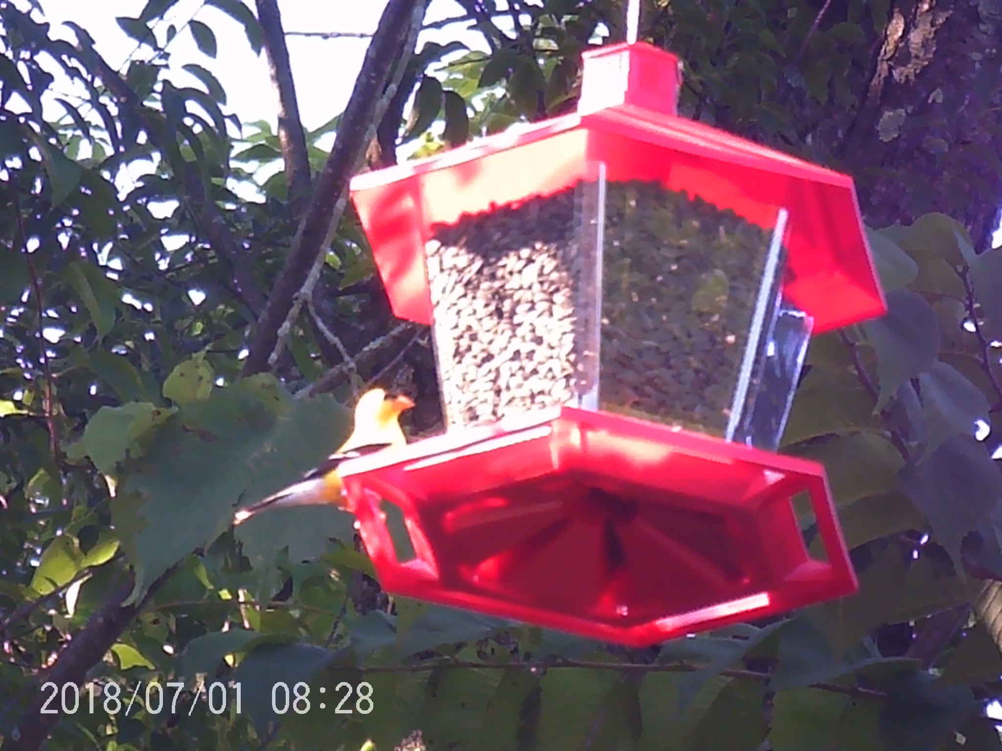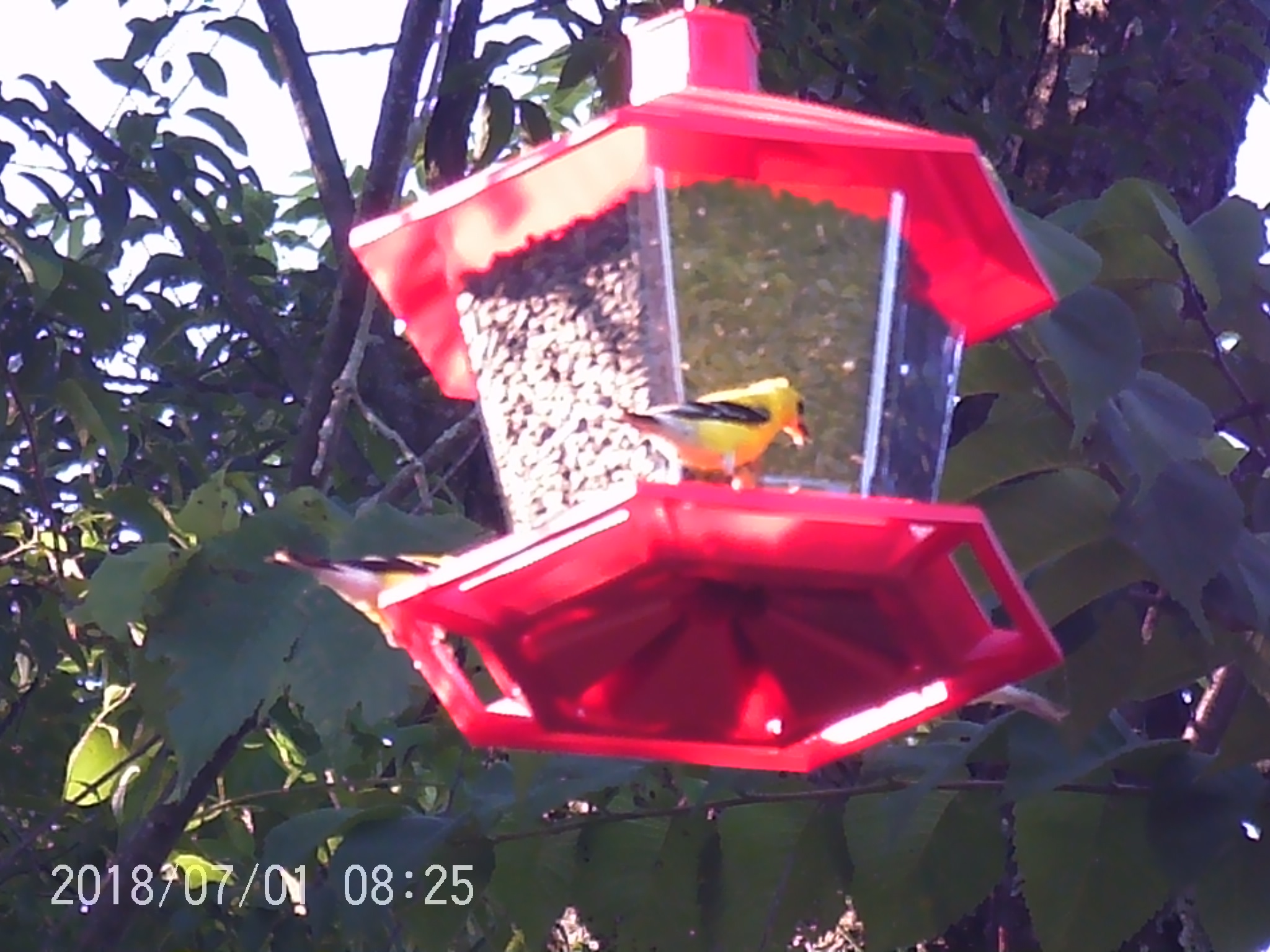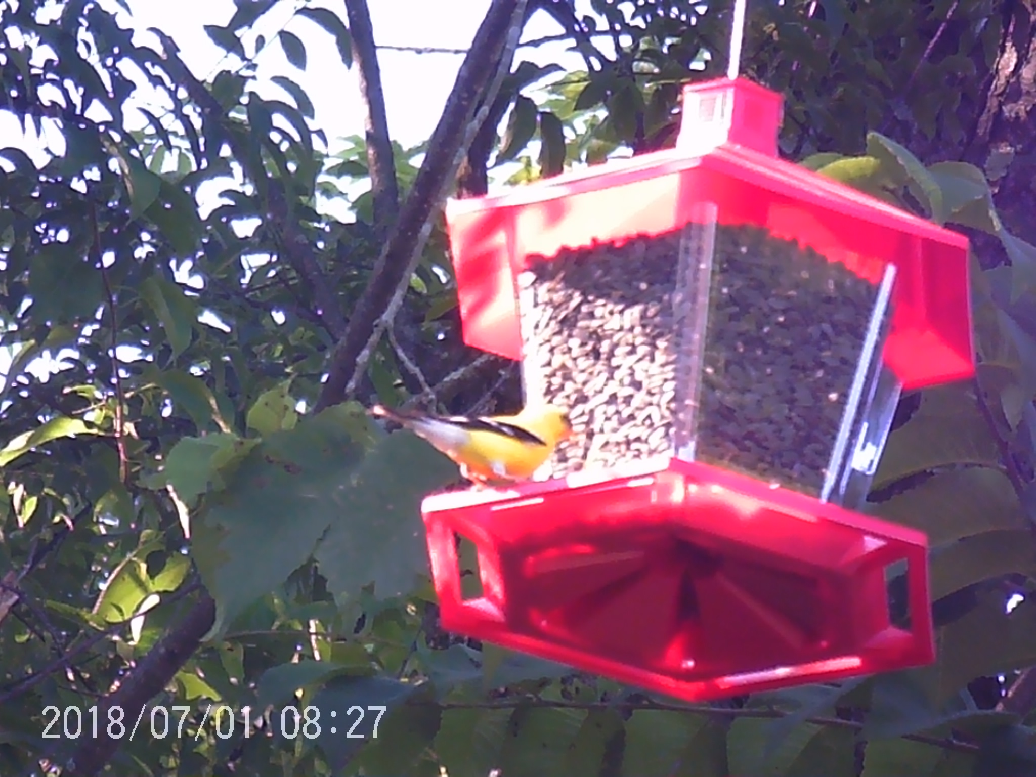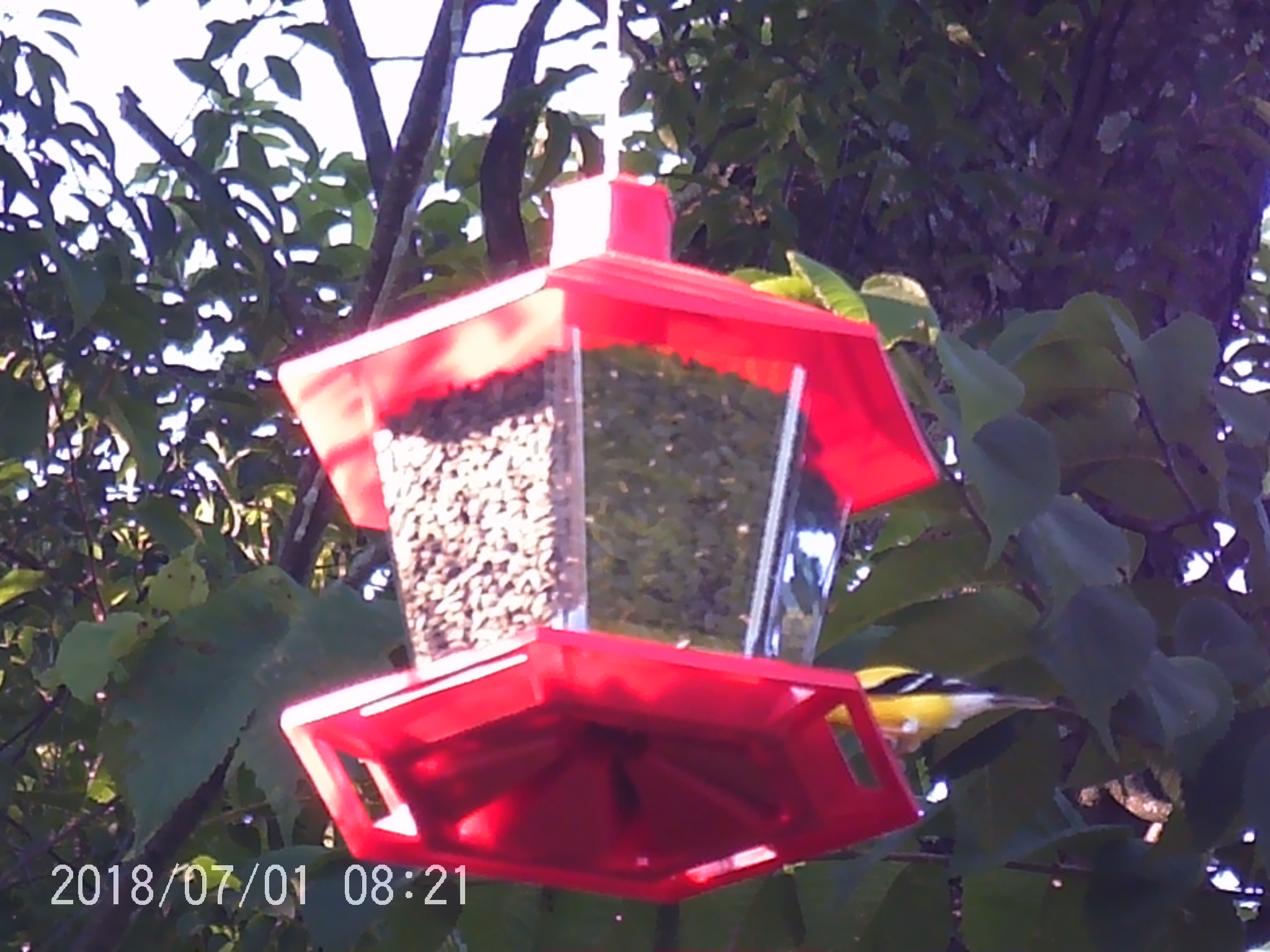 Yesterday afternoon (6/30/18) I purchased and put up his bird feeder. We have bears in the area so I rigged up a branch hanger and a steel cable to raise and lower it so the bears can’t get to it.