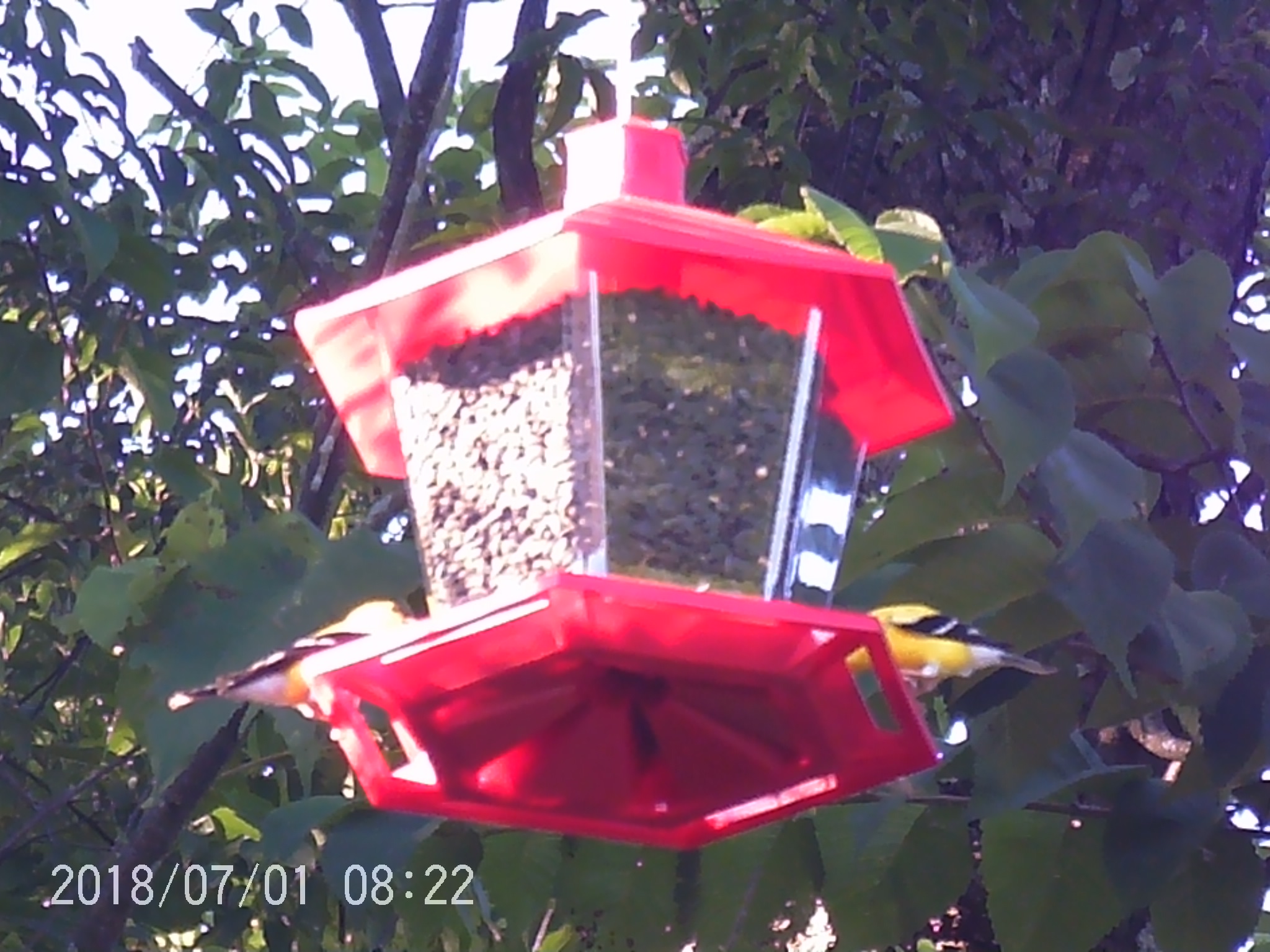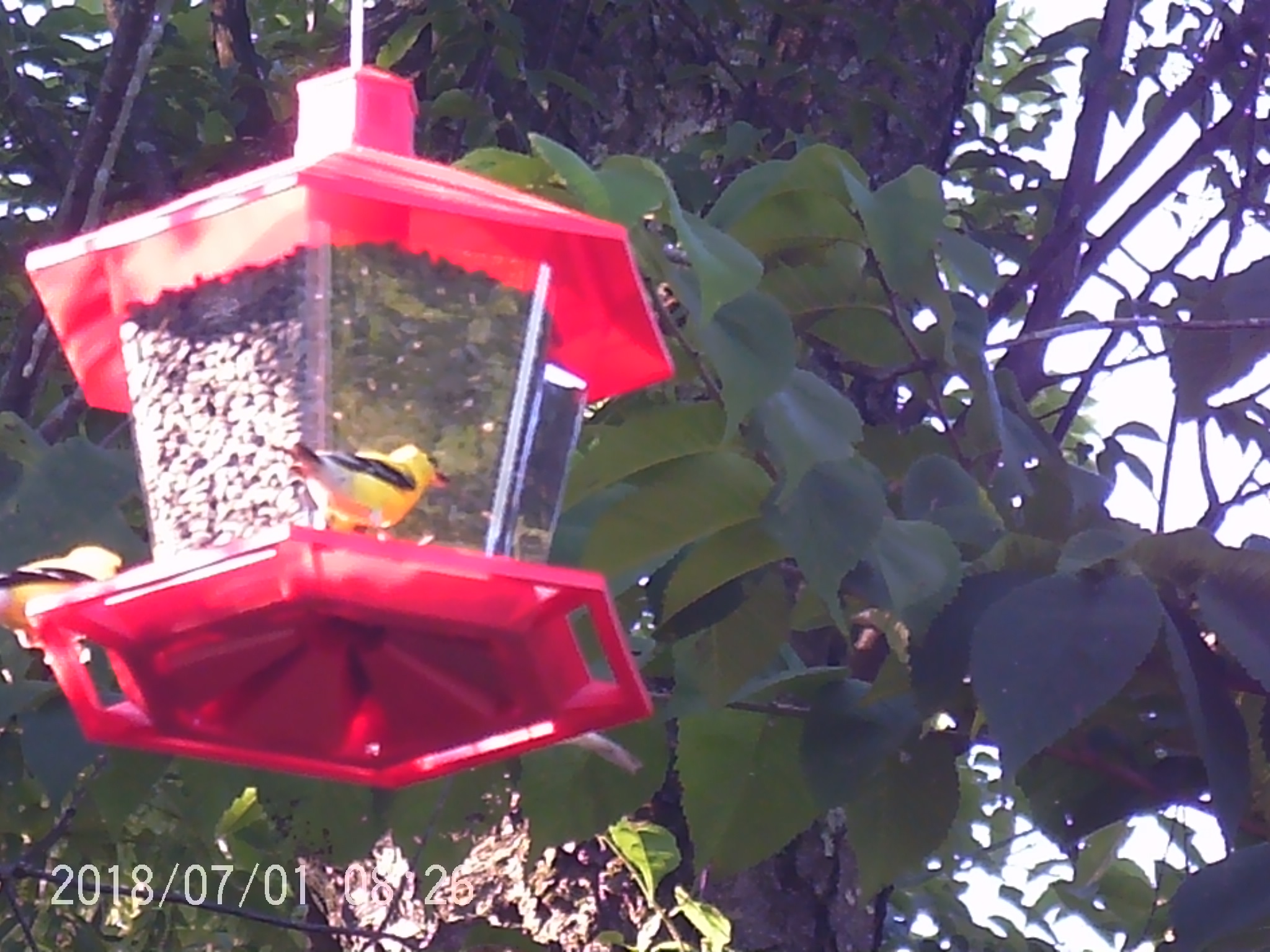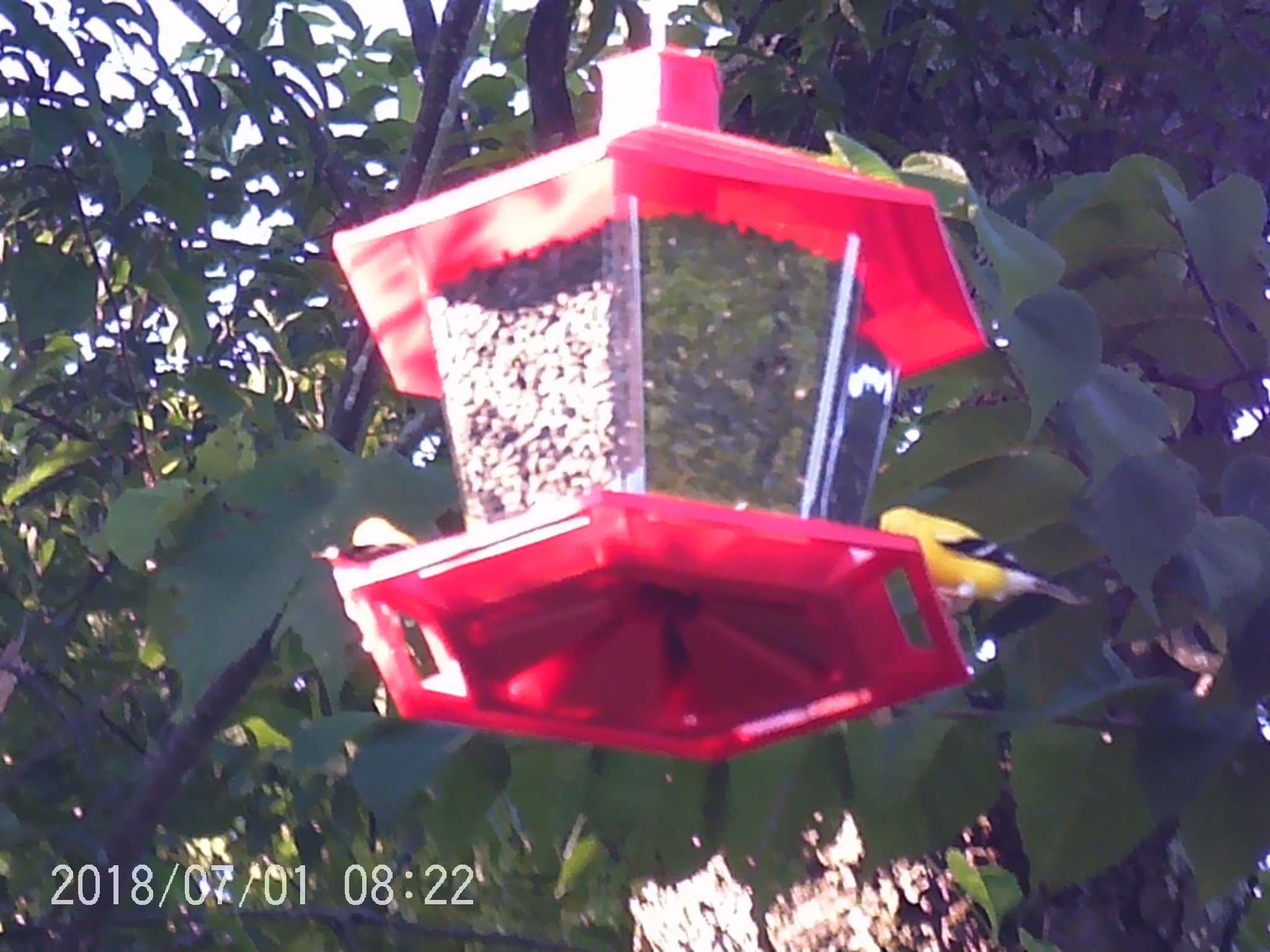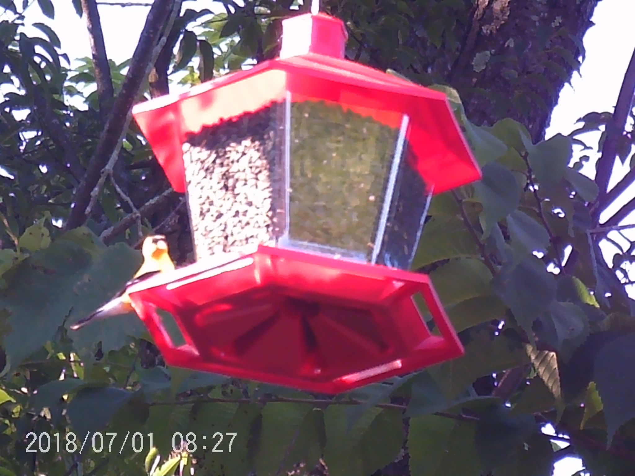Yesterday afternoon (6/30/18) I purchased and put up his bird feeder. We have bears in the area so I rigged up a branch hanger and a steel cable to raise and lower it so the bears can’t get to it.