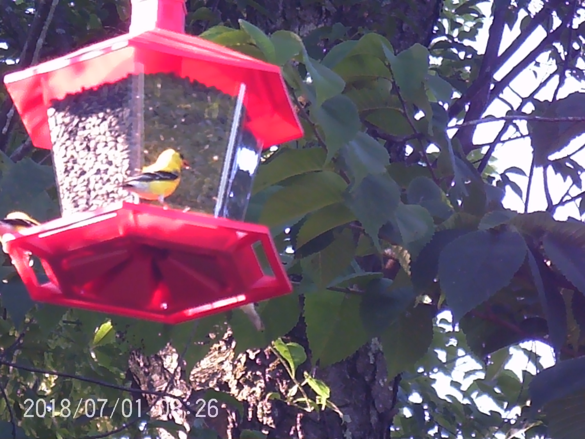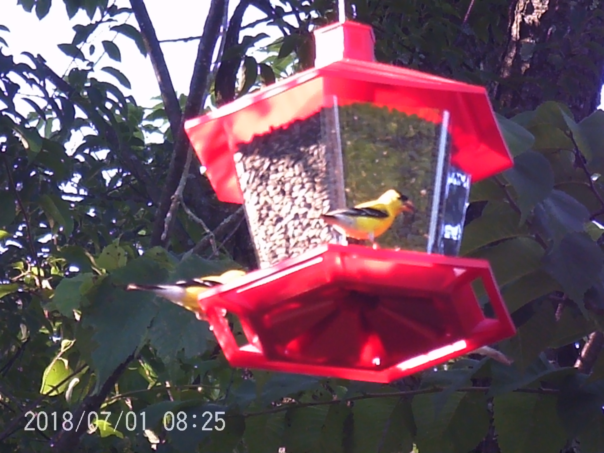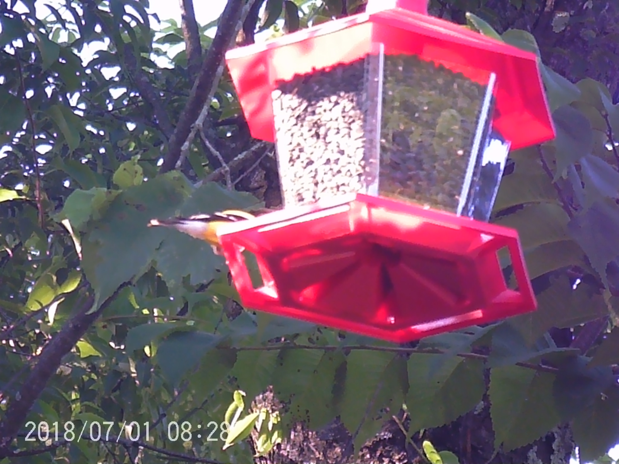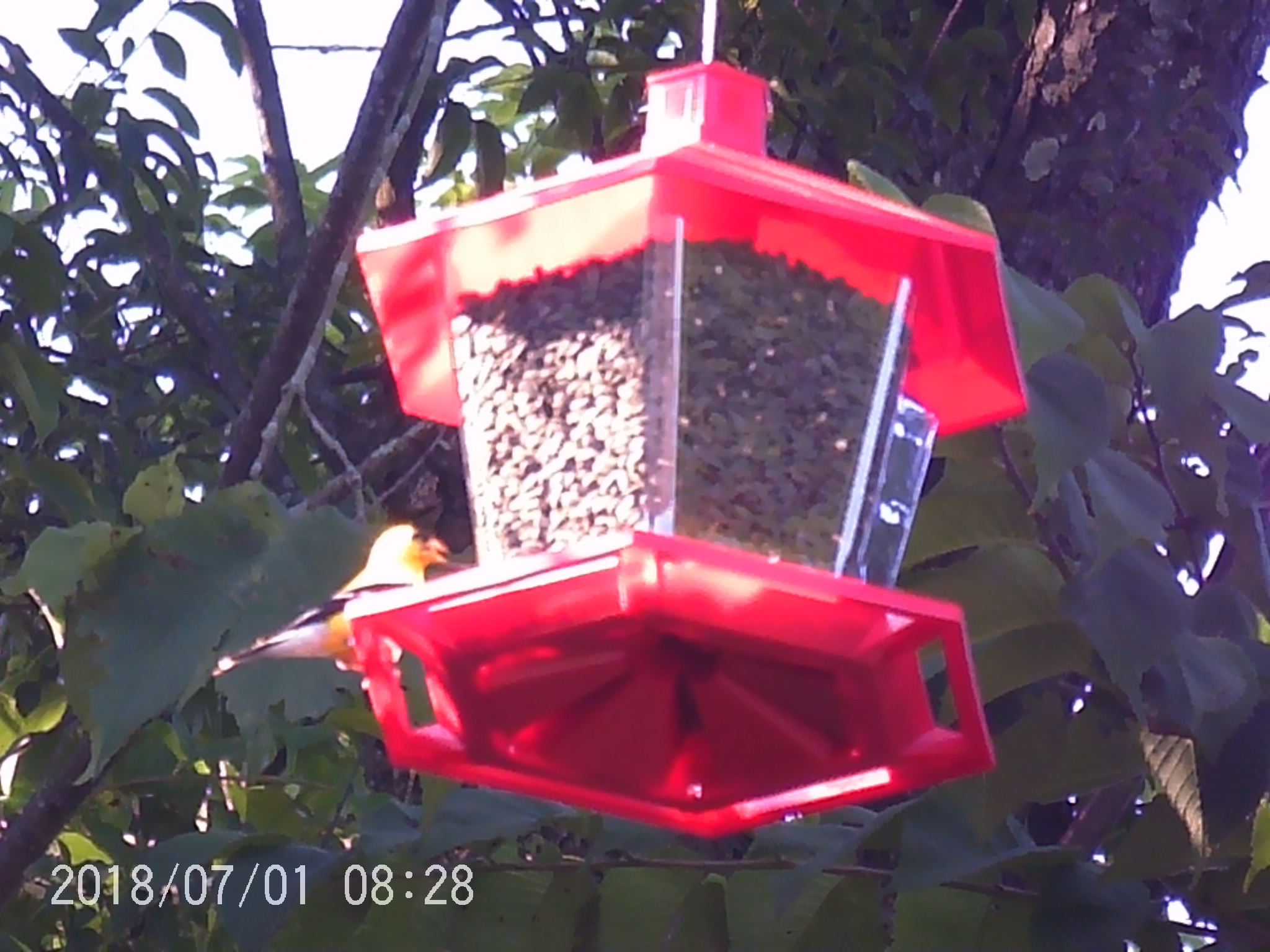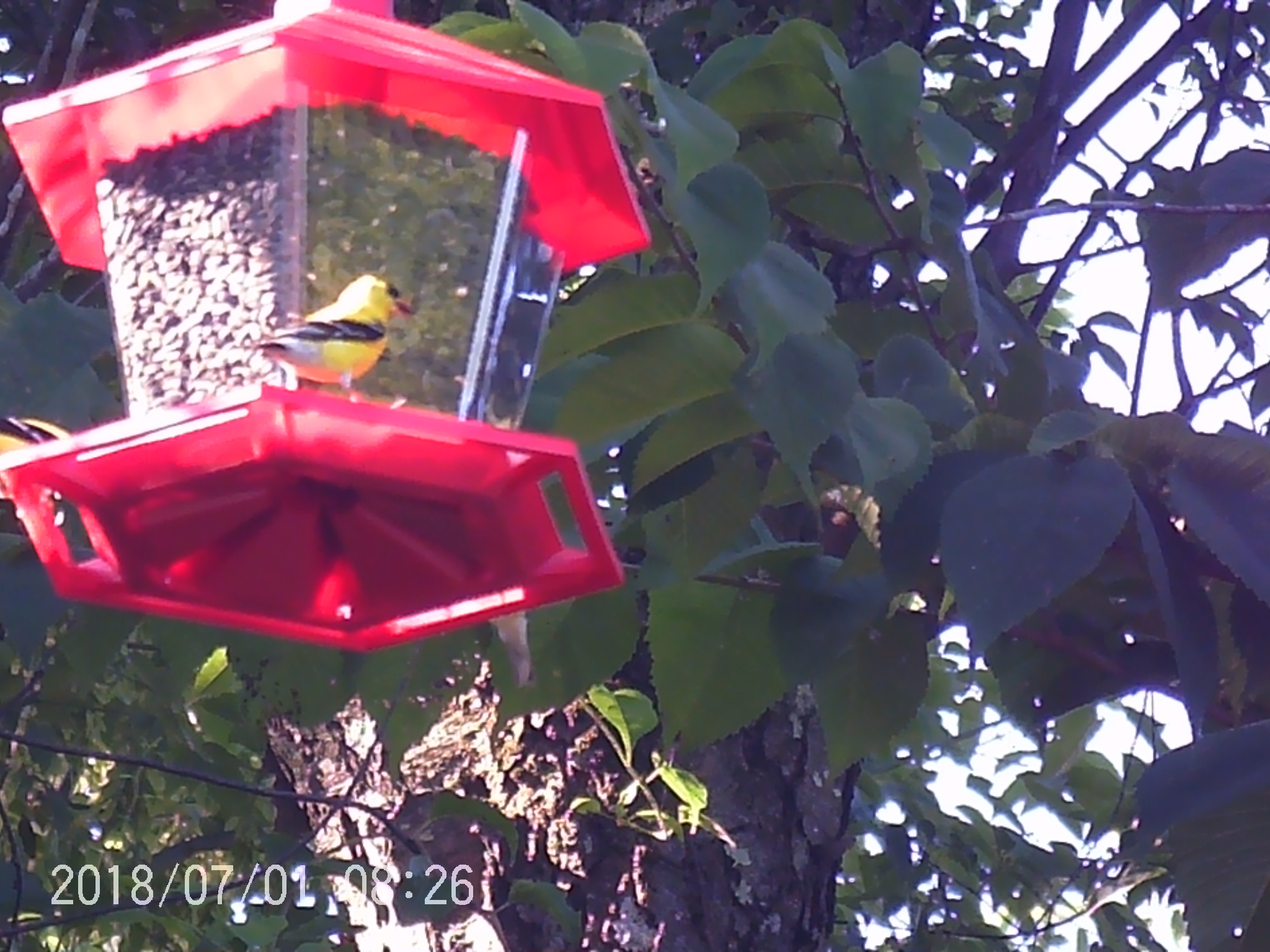 Yesterday afternoon (6/30/18) I purchased and put up his bird feeder. We have bears in the area so I rigged up a branch hanger and a steel cable to raise and lower it so the bears can’t get to it.
