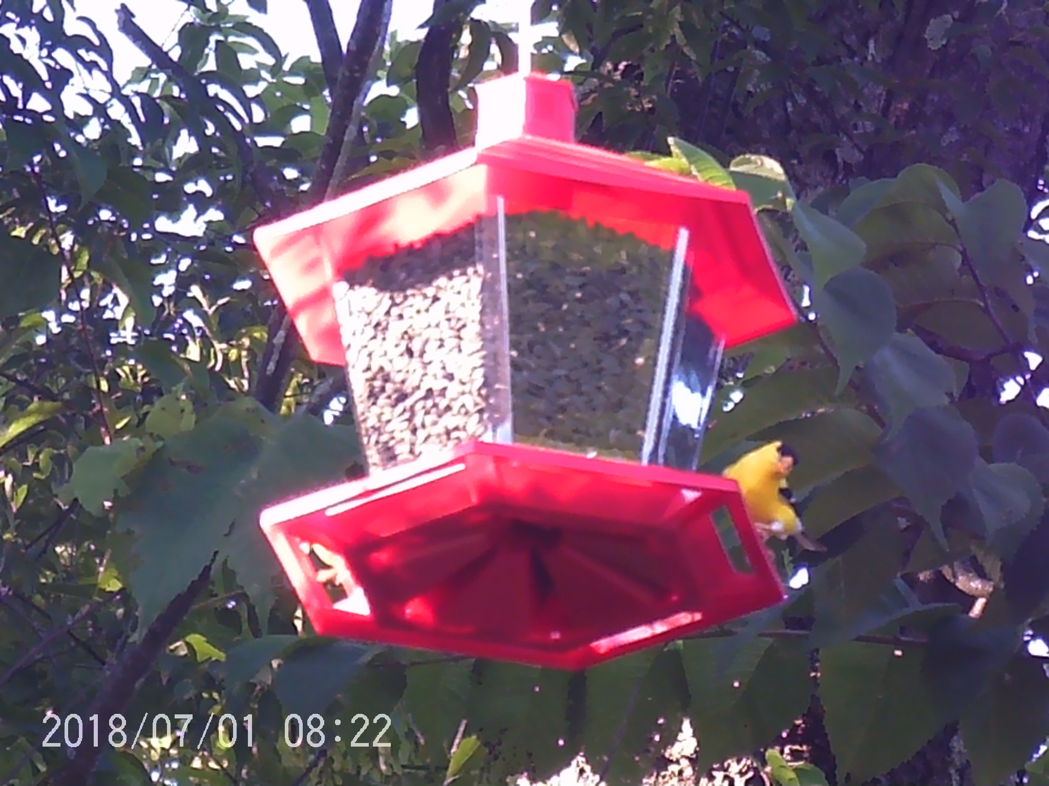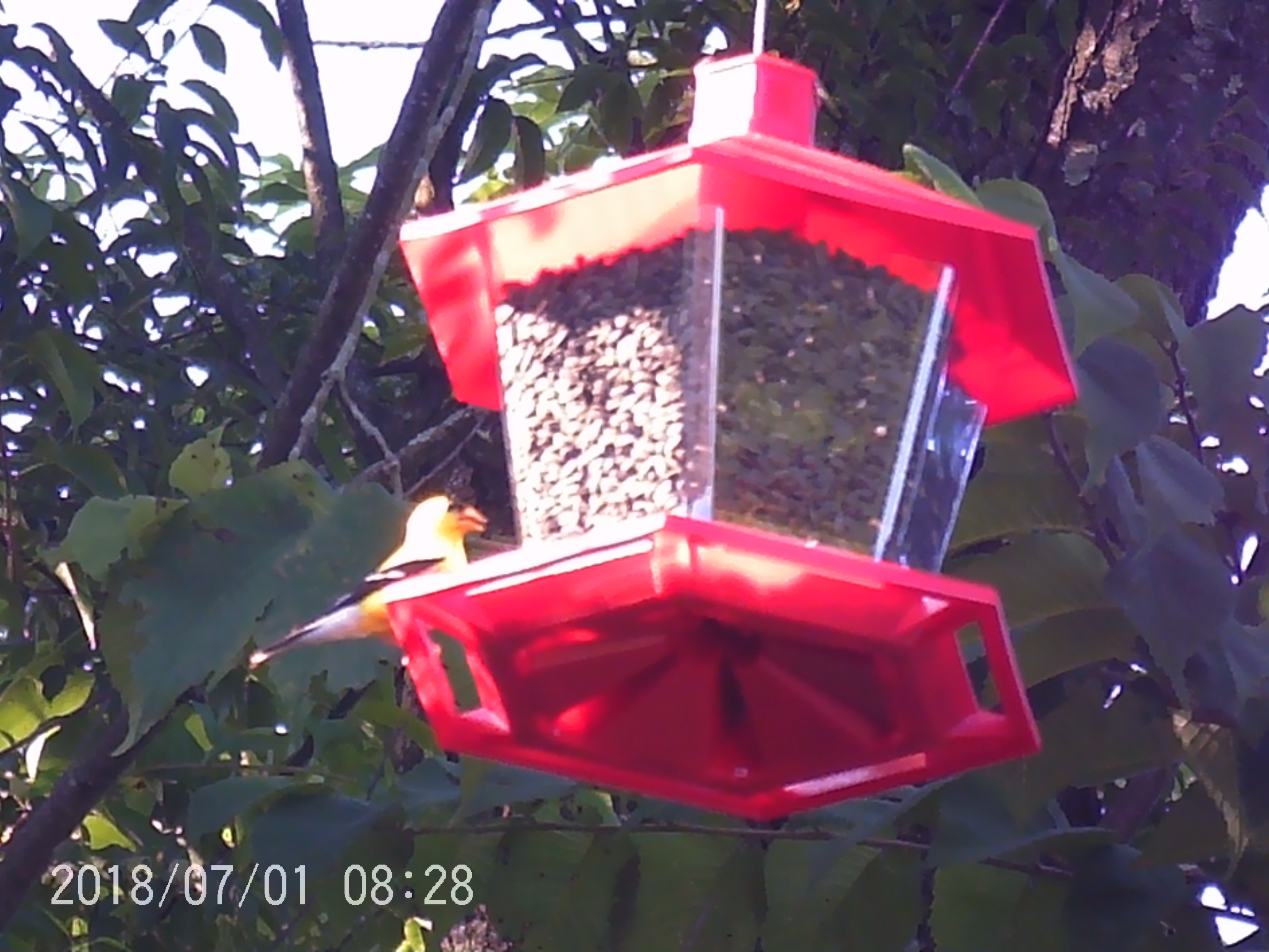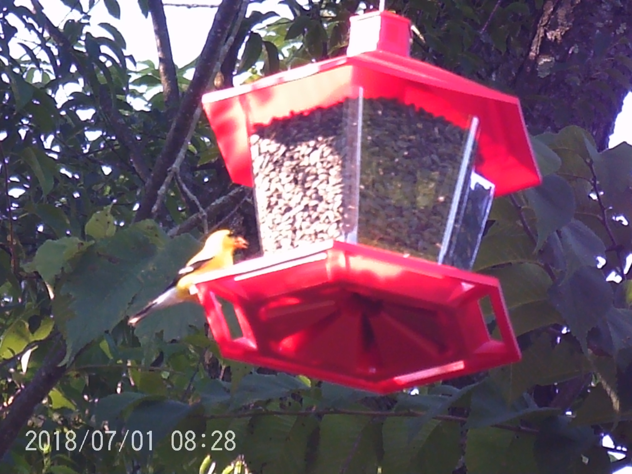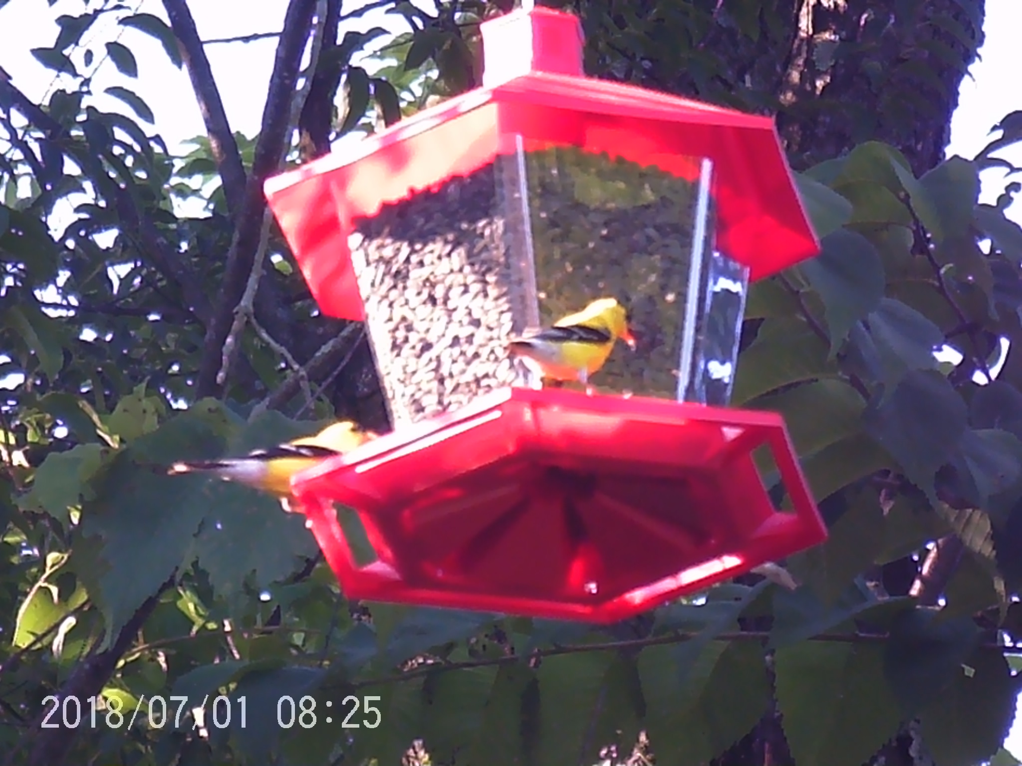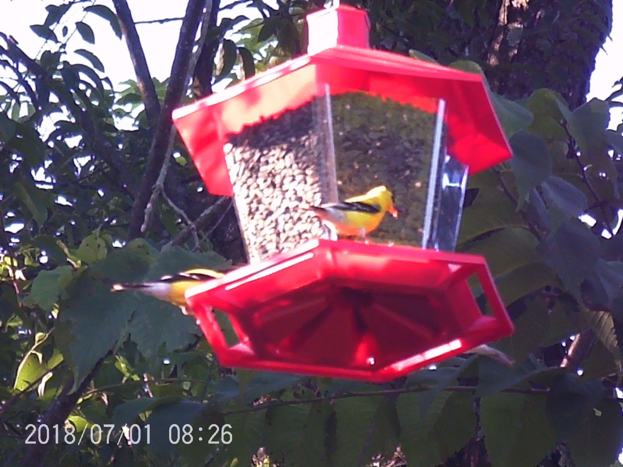 Yesterday afternoon (6/30/18) I purchased and put up his bird feeder. We have bears in the area so I rigged up a branch hanger and a steel cable to raise and lower it so the bears can’t get to it.