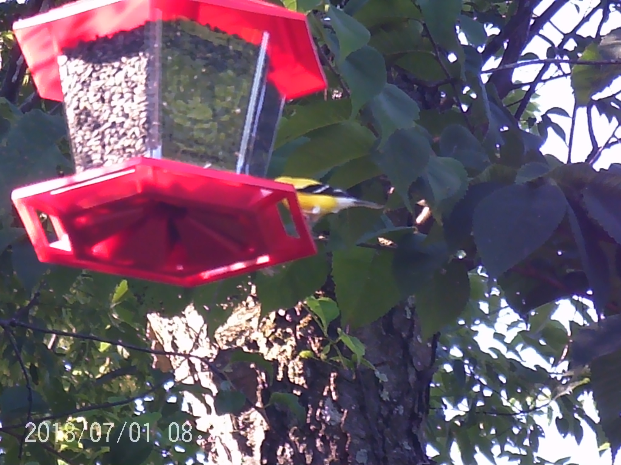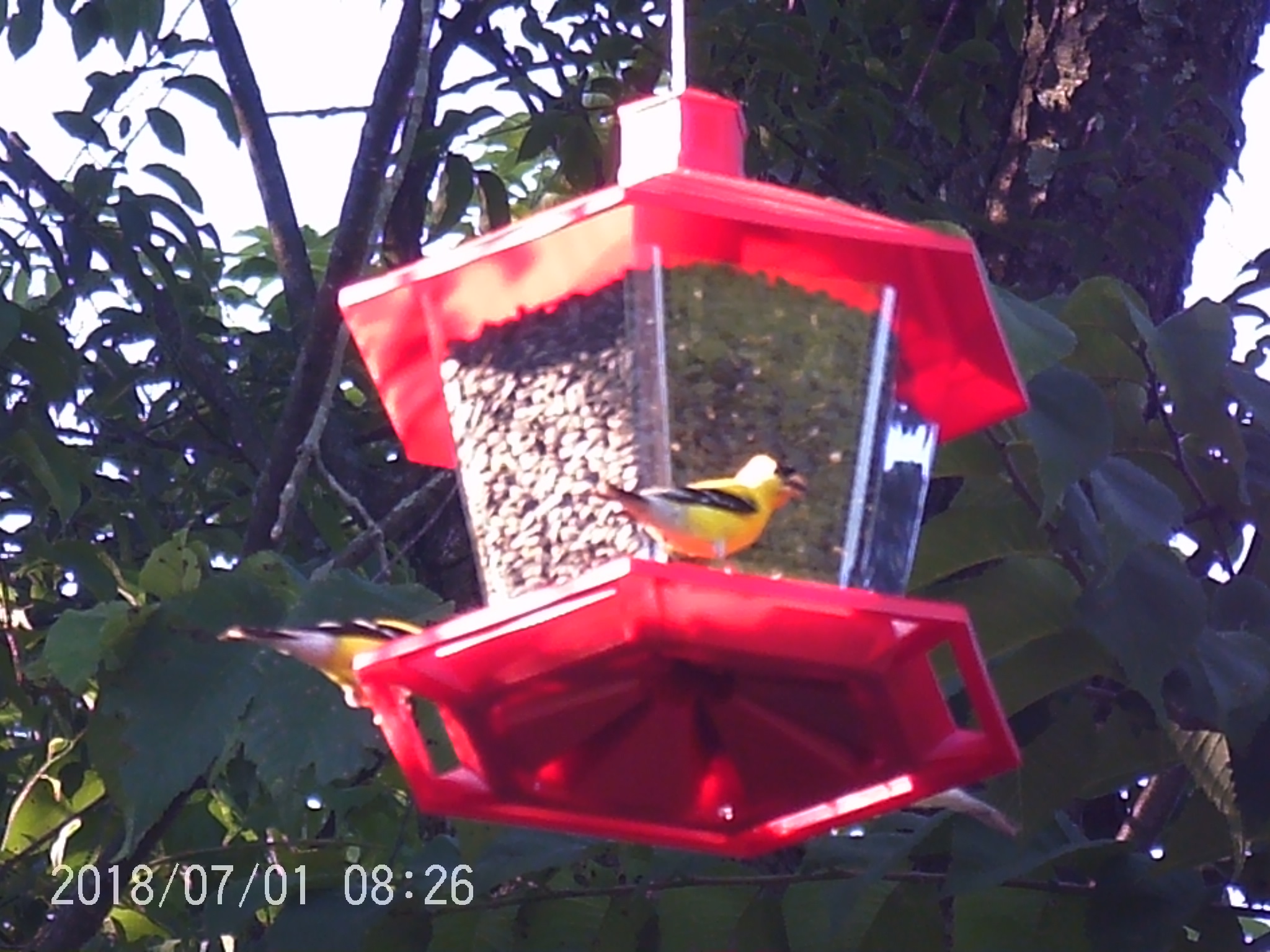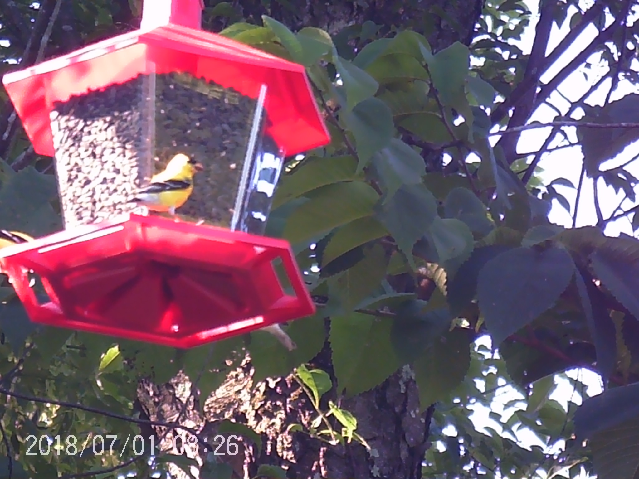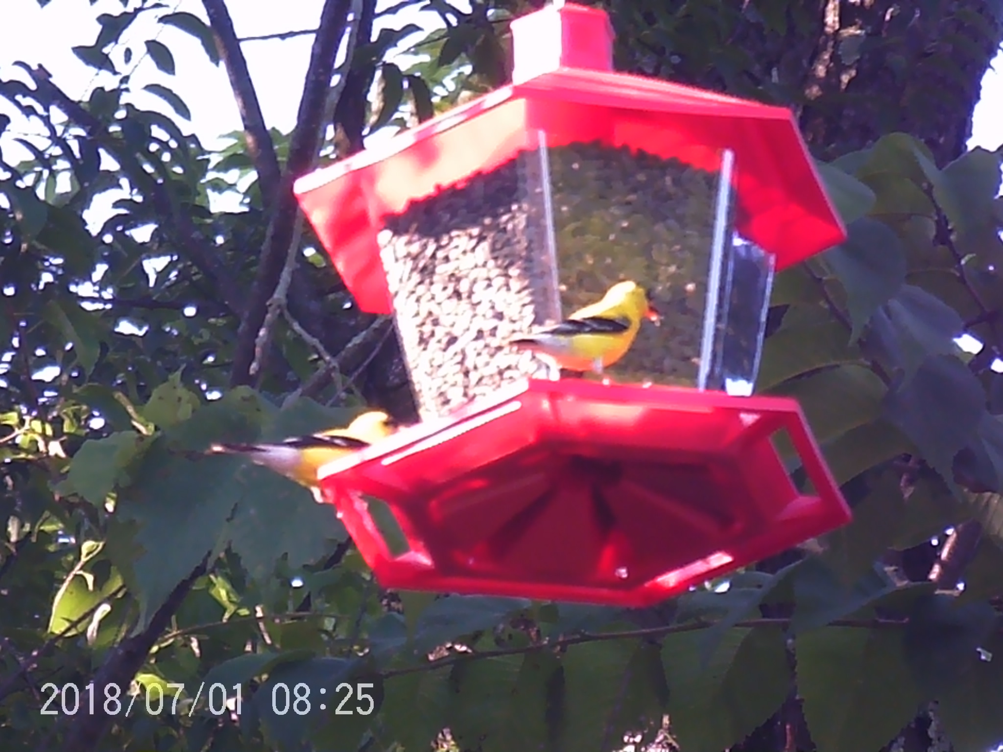 Yesterday afternoon (6/30/18) I purchased and put up his bird feeder. We have bears in the area so I rigged up a branch hanger and a steel cable to raise and lower it so the bears can’t get to it.