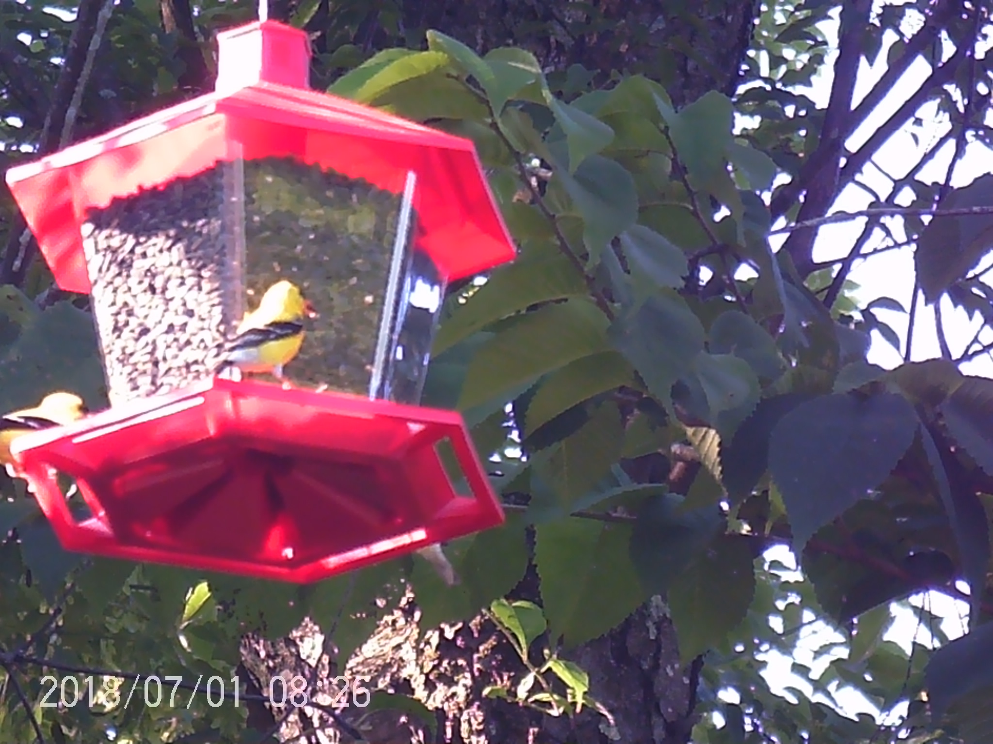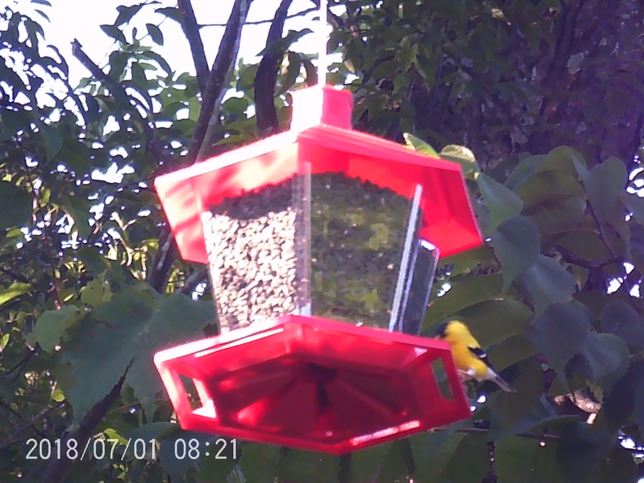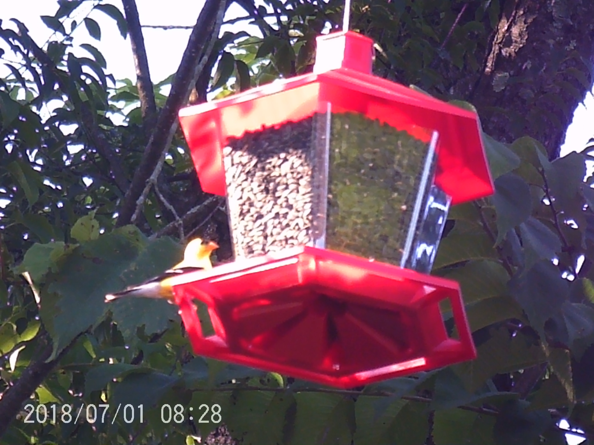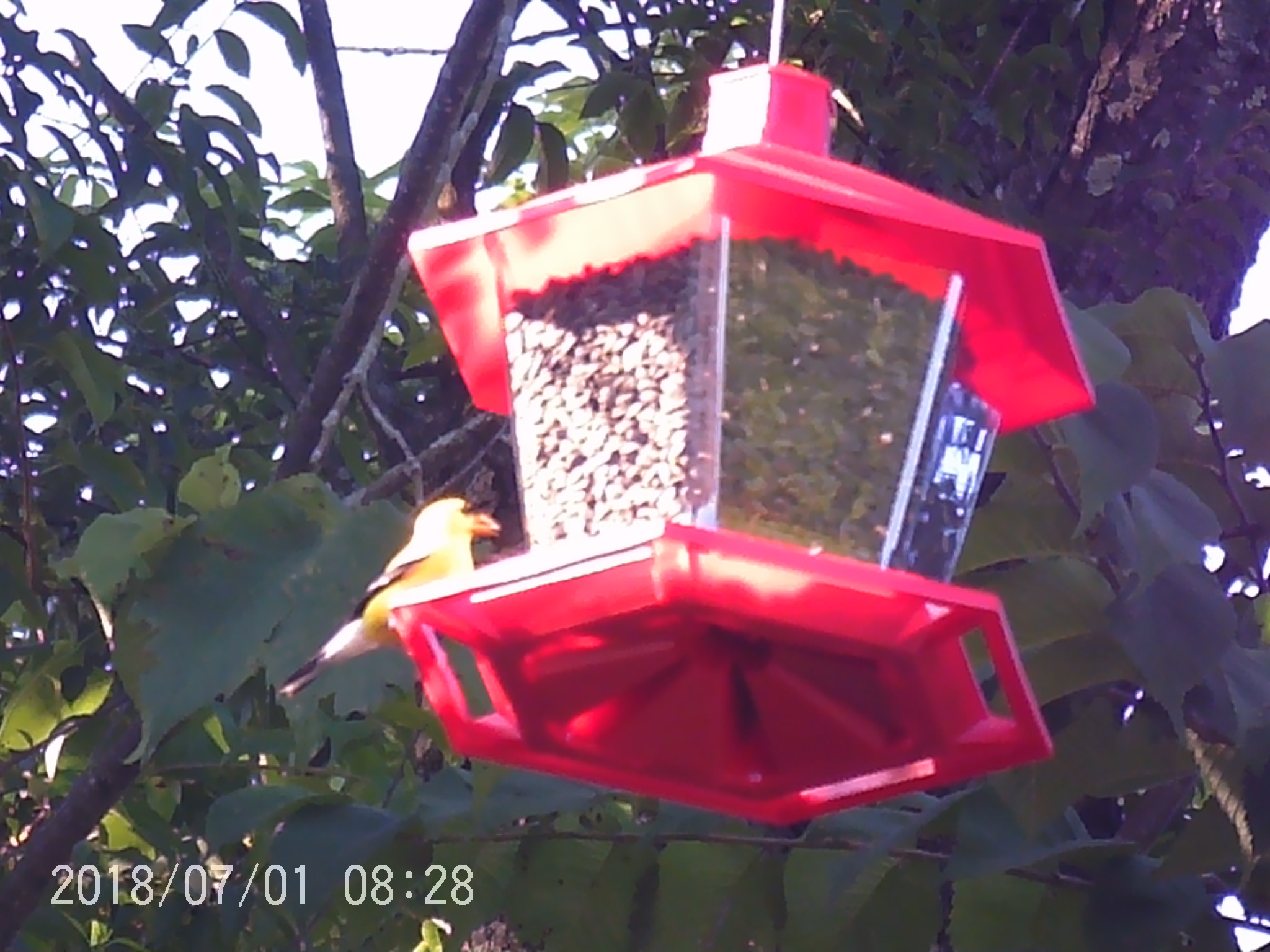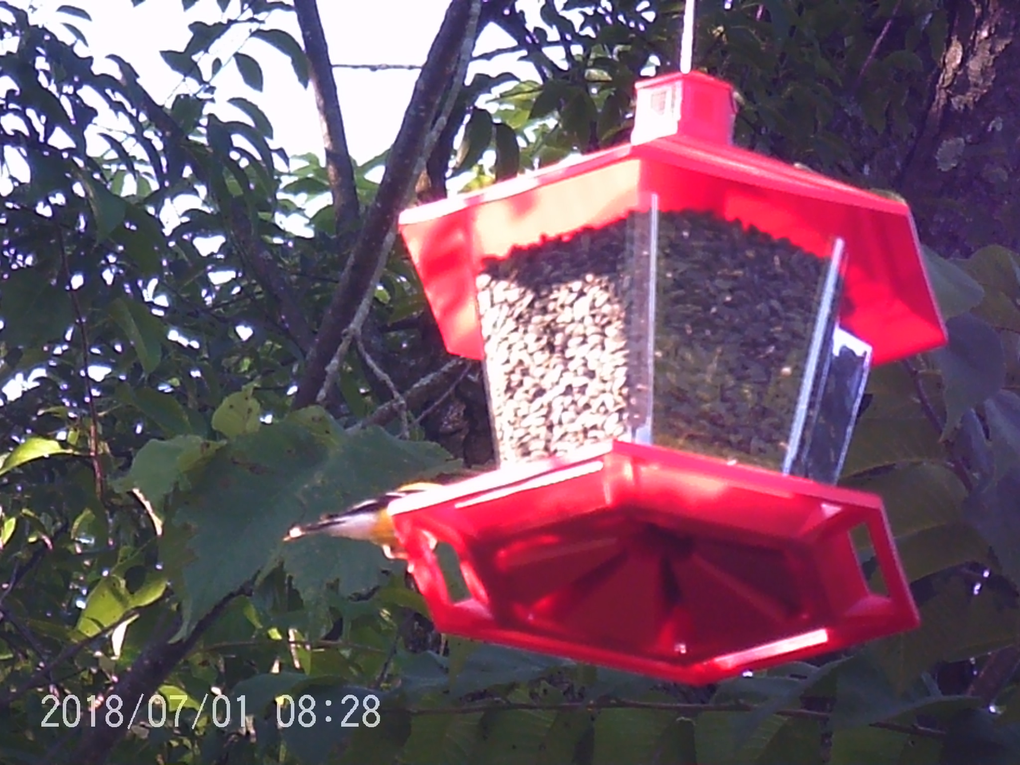 Yesterday afternoon (6/30/18) I purchased and put up his bird feeder. We have bears in the area so I rigged up a branch hanger and a steel cable to raise and lower it so the bears can’t get to it.