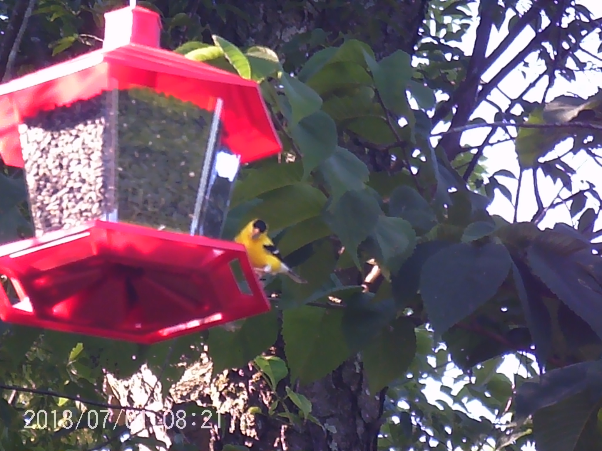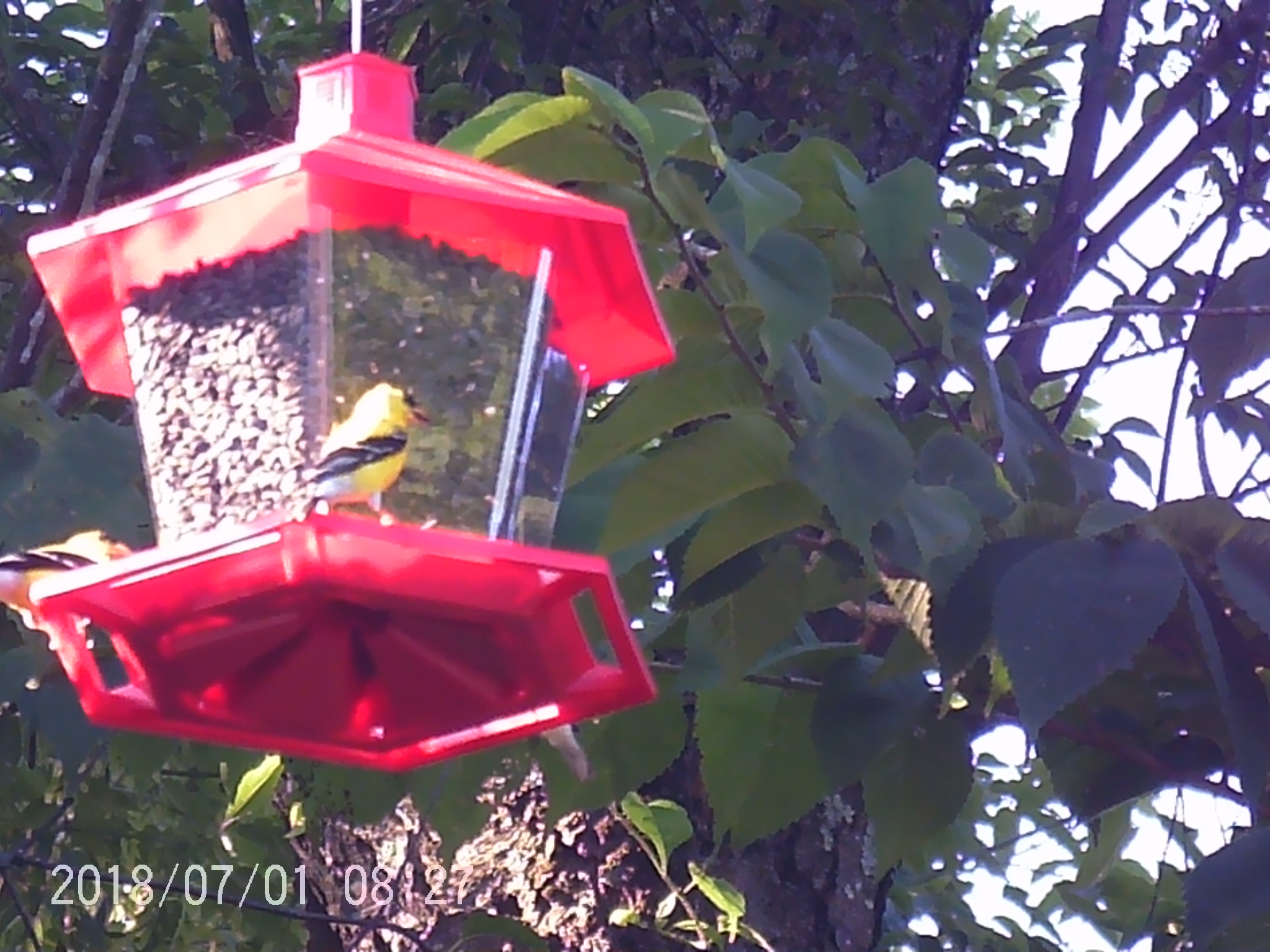 I was able to sit outside for about an hour watching the activity and the most noticable visitors to the feeder were 4 breeding male American Goldfinches (Identification link below).