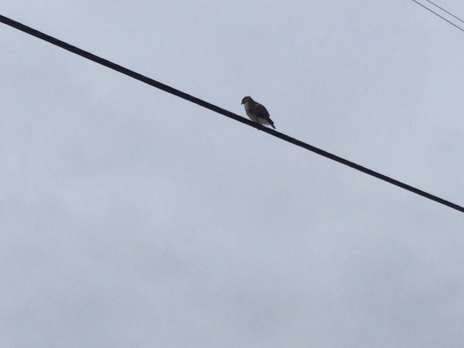 As I was leaving the house this hawk ( I believe it is a Red Tailed Hawk) flew over and perched on this wired right in front of me, only about 50 feet from my driveway. It also struck me as probably a juvenile.