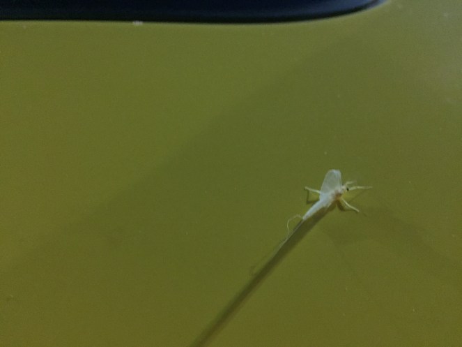 My day started by waking up after having a dream about Sarah. My travels today allowed me to stop by the cemetery twice and visit. After the second visit I stopped to get some food and a dragonfly flew around my car when I was in line and landed on my driver side mirror with the window down kind a looked at me. And finally when I came out of the store after only been in there for a few minutes my car was covered in about 20 of these insects shown below.